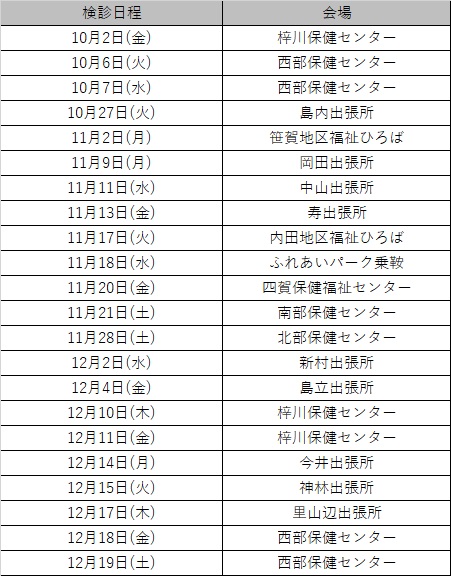 (1)指定医療機関 指定医療機関ごとに異なります。指定医療機関の特定健診等実施月をご確認ください。 (2)医師会検査健診センター 令和8年7月1日~令和9年2月27日 (3)支所・出張所 実施場所ごとに異なります。令和8年度 支所・出張所 特定健診日程 [その他のファイル/111KB] |