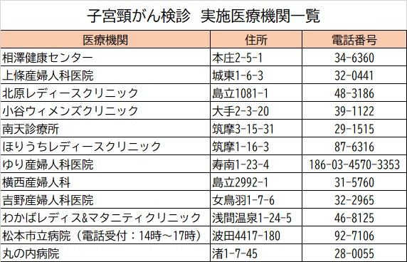 (1)指定医療機関 子宮頸がん実施医療機関一覧 [その他のファイル/112KB] 子宮がん検診実施医療機関を検索し、希望する医療機関に直接電話申込み (2)支所・出張所等(検診車)