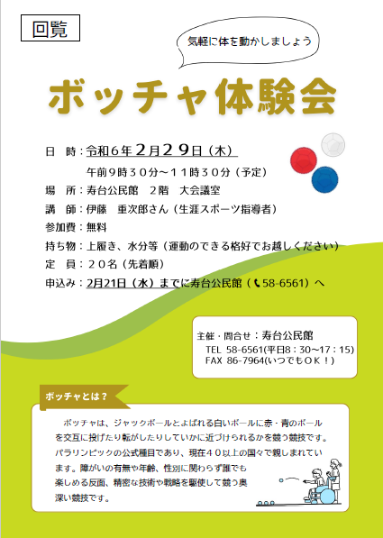 寿台公民館では、定期的なボッチャ講座の開催を予定しています。