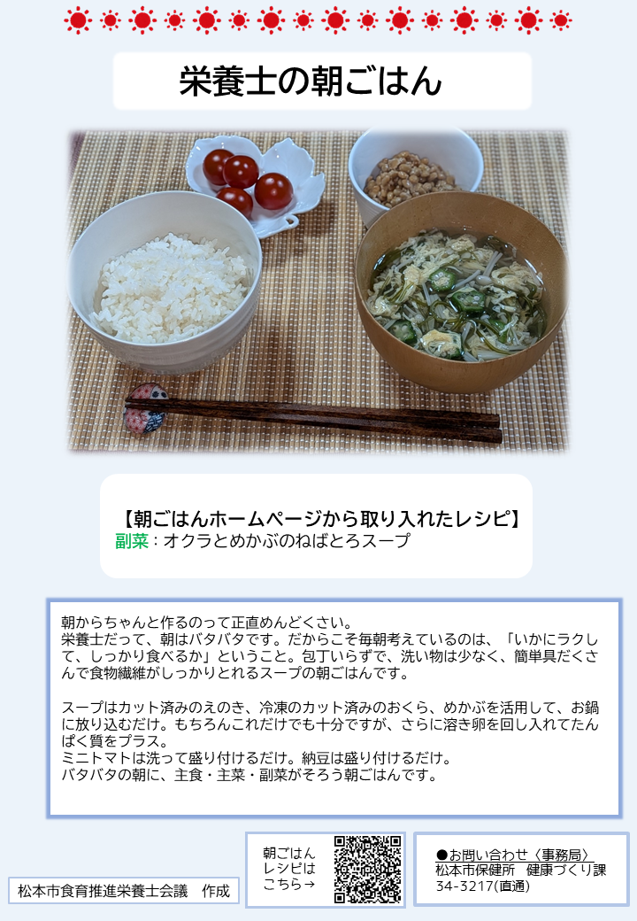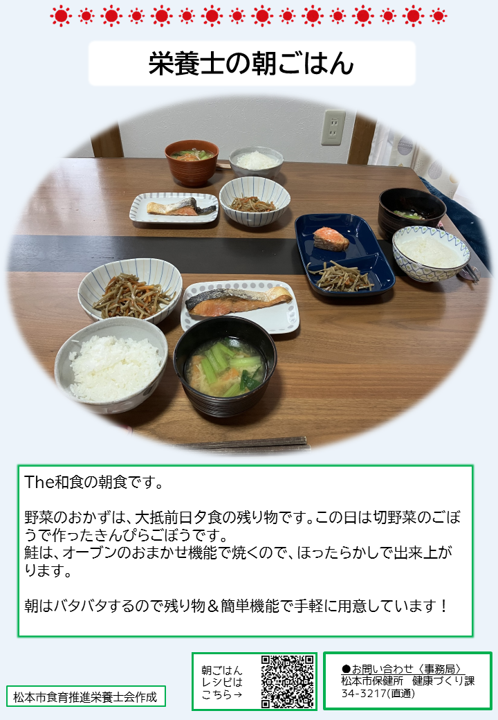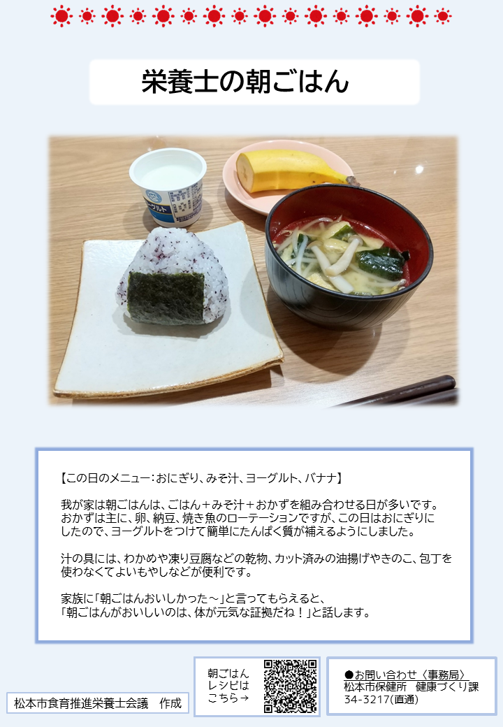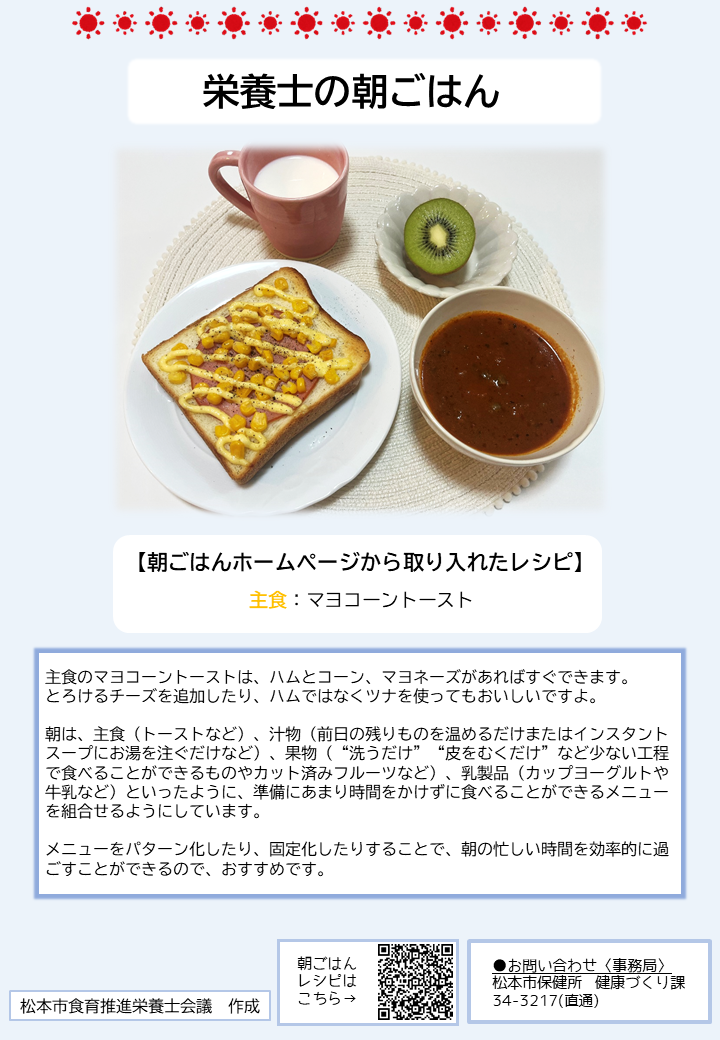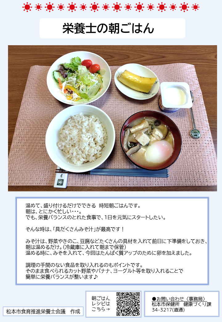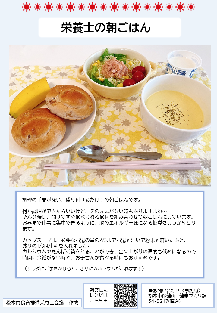 こちらのページでは、簡単に作れる朝ごはんのレシピや、松本市管理栄養士の普段の朝食の様子、朝ごはんに関する松本市のおすすめ情報を紹介しています。