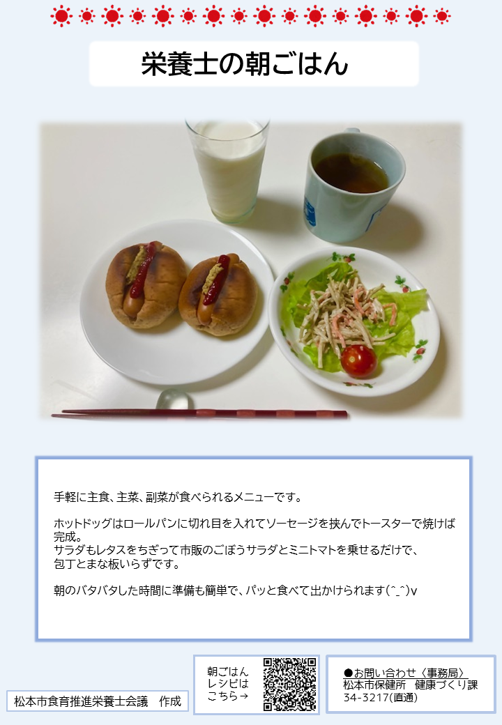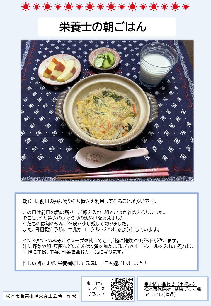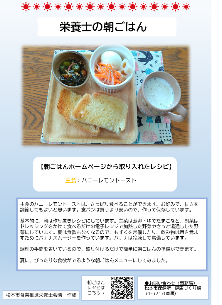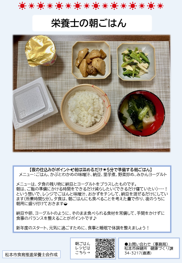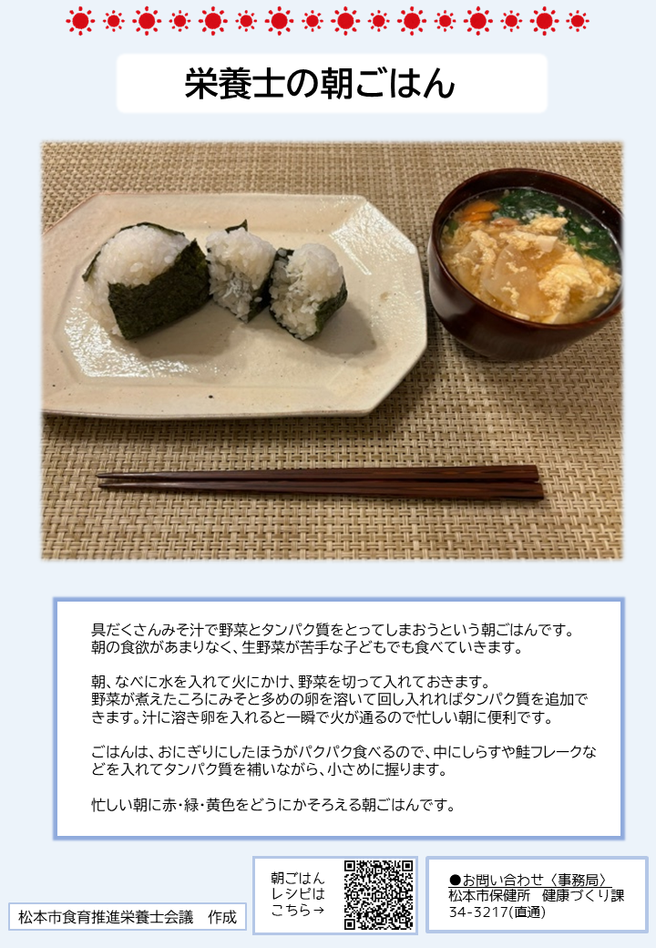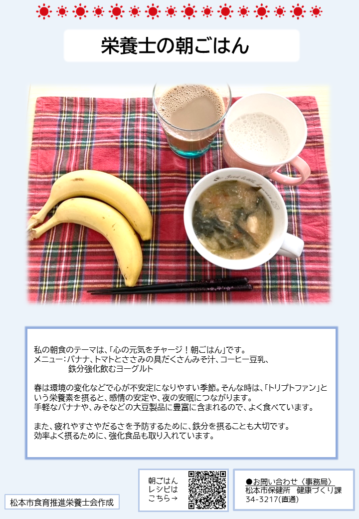 こちらのページでは、簡単に作れる朝ごはんのレシピや、松本市管理栄養士の普段の朝食の様子、朝ごはんに関する松本市のおすすめ情報を紹介しています。